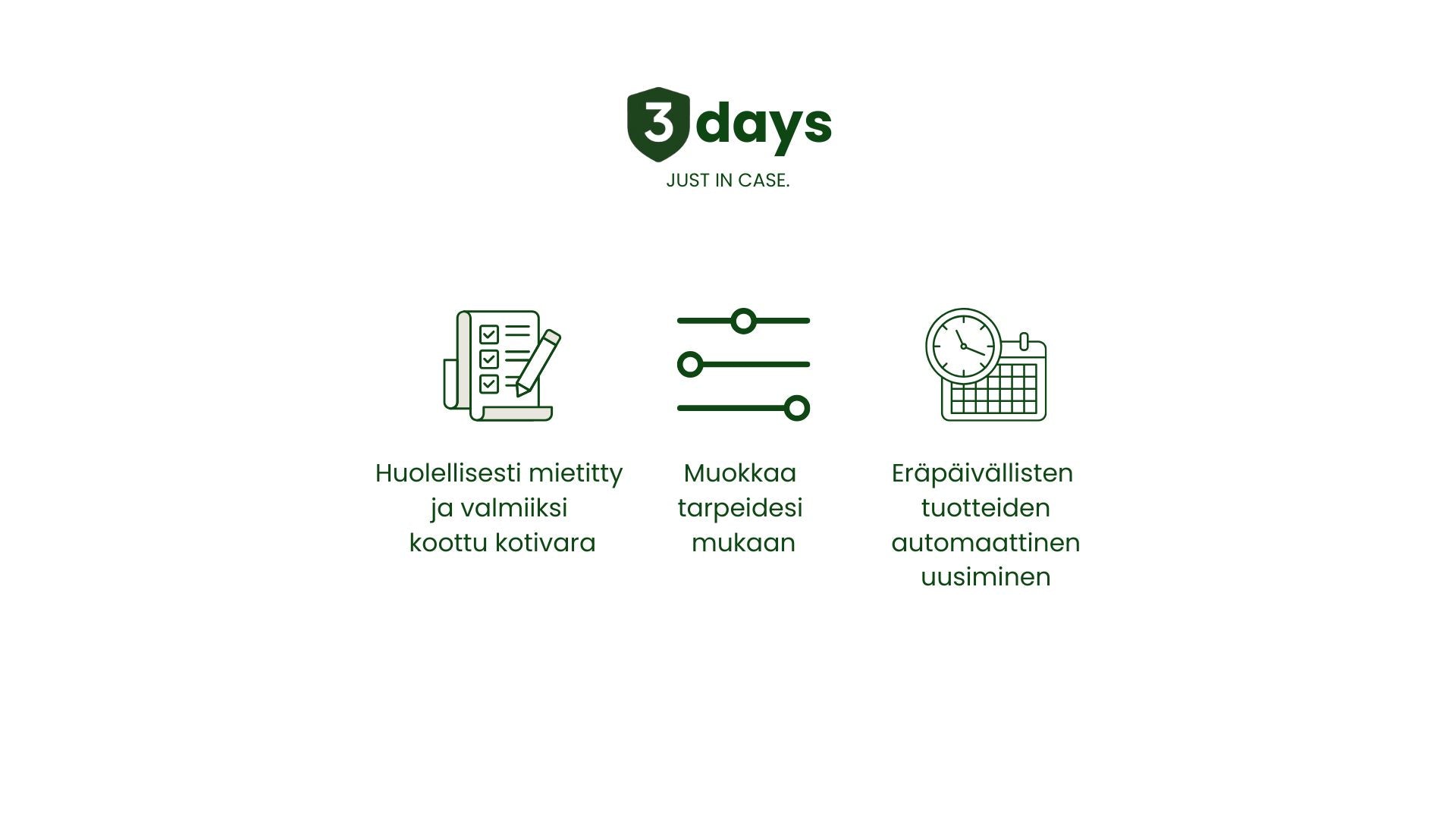 72 tunnin kotivarapakkauksemme sisältävät kaiken mitä tarvitset erilaisissa poikkeustilanteissa. Olemme perehtyneet viranomaisohjeistuksiin ja valinneet niiden pohjalta helpon, hyvänmakuisen ja monipuolisen kotivarapaketin.