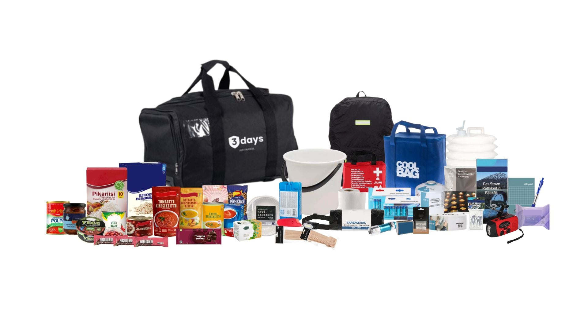 3days kotivarapakkaus sisältää kaiken, mitä tarvitset arjen häiriötilanteiden varalle, oli kyseessä sitten sähkökatko, vesijakelun häiriö, pitkittynyt lakko tai jokin muu poikkeustilanne. Kotivarapakkauksessa on viranomaissuositusten mukaisesti ruokaa ja tarvikkeita 72 tunniksi.