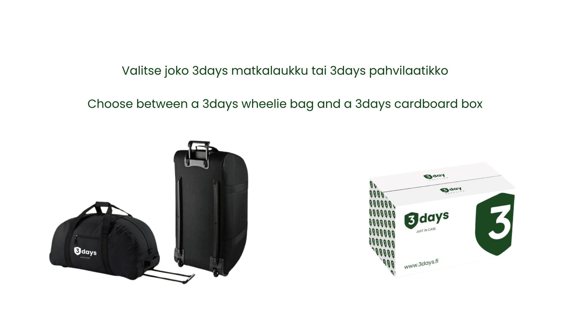 Tämä 3days kotivarapakkaus sisältää tarvikkeet kahdelle henkilölle. Täydennä 3days kotivarapakkaus taloutesi tarpeita vastaavaksi +1 lisäpaketeilla, jotka myydään erikseen. Voit valita pakkausvaihtoehdoksi joko kätevän 3days matkalaukun tai vahvan 3days pahvilaatikon. Tarjoamme aina ilmaisen toimituksen Suomeen.