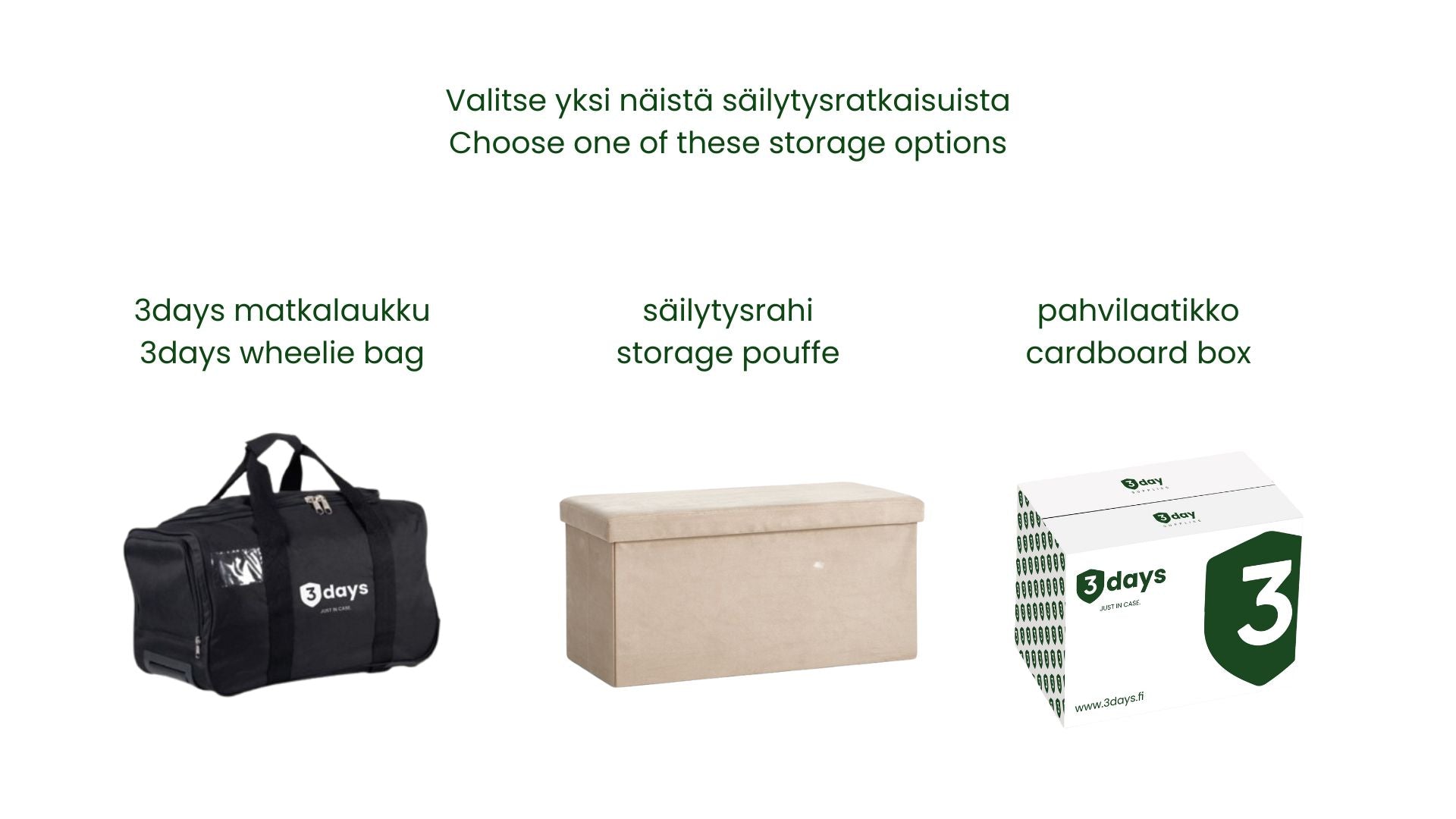 - Helppous: 3days kotivarapakkaukset ovat vaivaton ratkaisu. Olemme tutustuneet viranomaisohjeistukseen, erilaisiin skenaarioihin, vertailleet tuotteita, valinneet sopivimmat ja koonneet toimivan pakkauksen puolestasi.